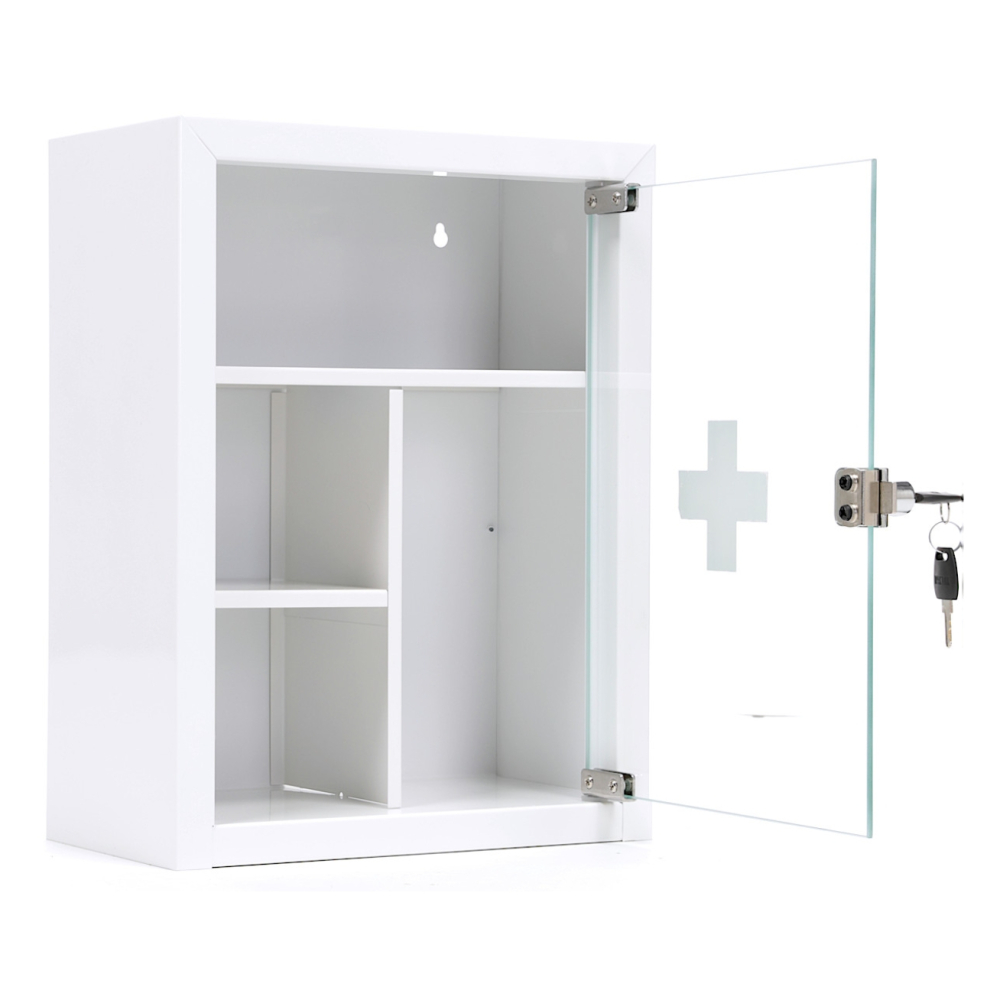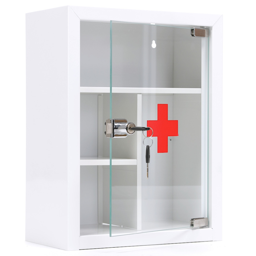 Металлическая аптечка AMD-39G предназначена для хранения медикаментов, средств первой помощи, медицинских аксессуаров. Представляет собой металлический короб со стеклянной дверцей, запирающейся ригельным ключевым замком. Внутри пространство аптечки разделено полками на четыре отделения. Короб окрашен порошковой белой краской для предотвращения коррозии.